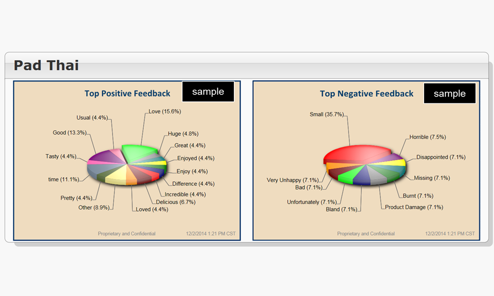 The contextual analysis of the comments about pad thai are broken into two general categories – positive comments and negative comments. In the negative comments category it is seen that the single biggest factor for complaints was portion size. People wanted to have larger portions when they placed an order.
