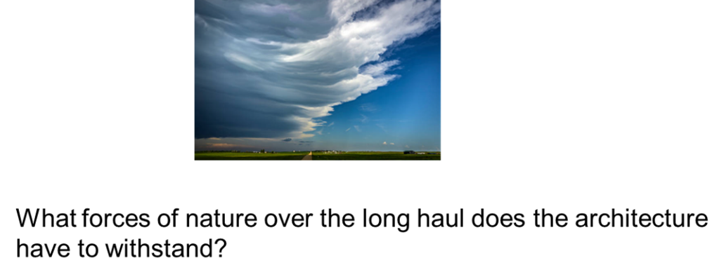 The architect must be aware of and plan for the long-term threats to the viability of the project. The builders of the Golden Gate Bridge had to plan for saltwater erosion. For the tides and currents that sweep through the bay. For the storms that blow in from the Pacific and in the unlikely event that the foundations of the bridge may be rammed by an errant ship.