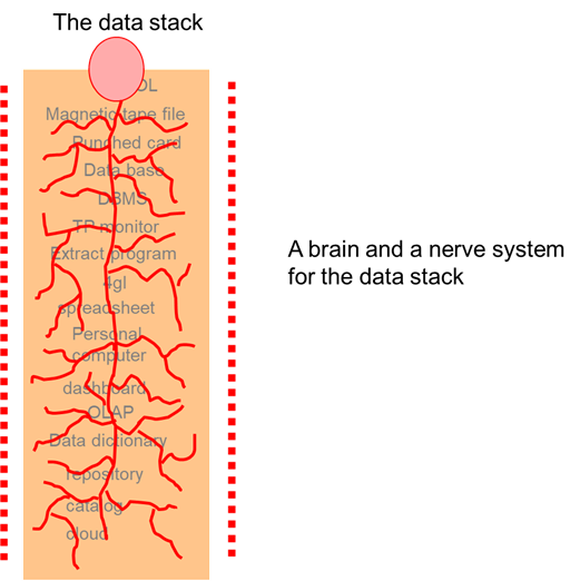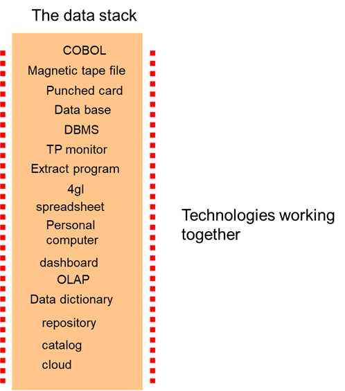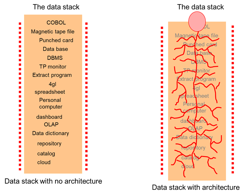 .The data stack appeared to satisfy the myriad needs of the technicians in coping with the avalanche of data. But the data stack had one major drawback. Unless there was an overlying architecture that sat beneath the stack, the stack produced conflicting and incorrect information.