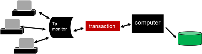 The ability of disk storage to directly access data led to transaction processing. The network accessing the disc storage data base was managed by a teleprocessing monitor. The disc storage data base was managed by a high performance data base management system.