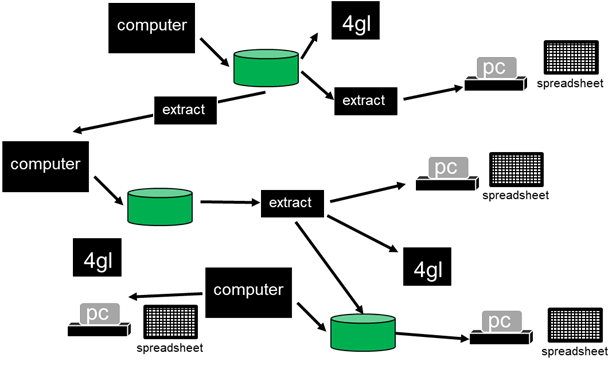 To add to the complexity, the personal computer and the spreadsheet made its appearance. The personal computer and the spreadsheet changed the dynamics of the control of data. Once computer processing was controlled by the IT organization. With the introduction of the personal computer and the spreadsheet, the end user could own and manage their own data without the interference of the IT organization.