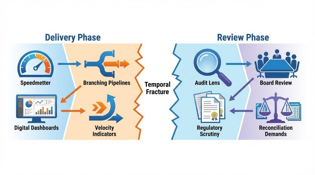 This temporal fracture is subtle but powerful. Architecture decisions are made during delivery, under schedule pressure, funding constraints, and competing priorities. They are judged later, when the system is examined under audit, board review, regulatory inquiry, or strategic reassessment. The individuals building the system rarely face scrutiny in the moment. The scrutiny arrives after the system has already shaped business decisions.